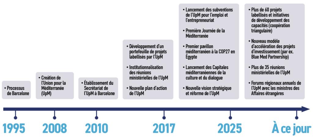 En 2010, le Secrétariat général de l’UpM est inauguré à Barcelone. Il est la plateforme opérationnelle de l’UpM, permettant de concrétiser les décisions prises par les États membres, par le biais de la préparation de réunions ministérielles, de la mise en œuvre de plateformes de dialogue régional et du développement de projets stratégiques régionaux.